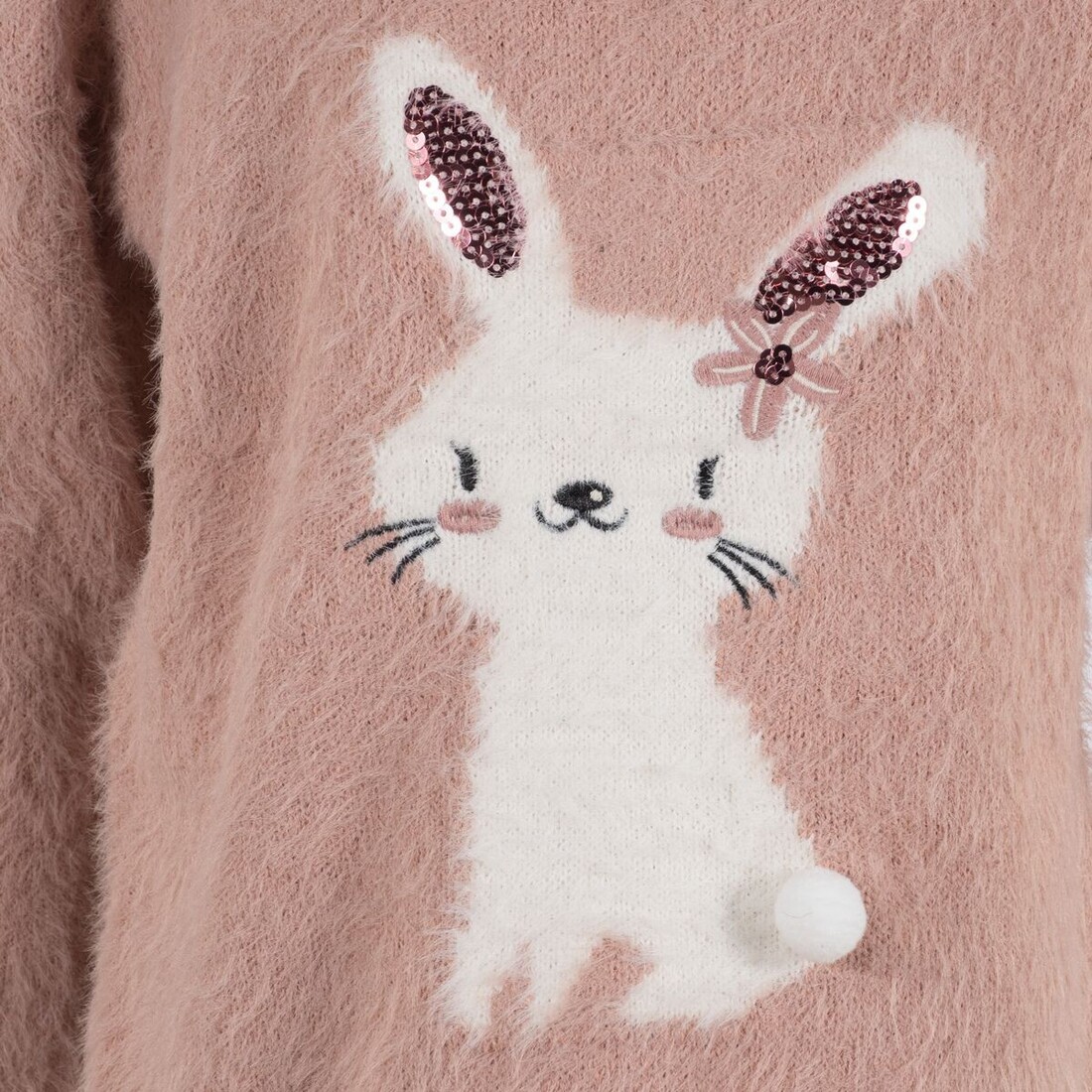 - Ζεστό και απαλό πουλόβερ με σχέδιο λαγουδάκι και λεπτομέρεια παγέτες στα αυτάκια