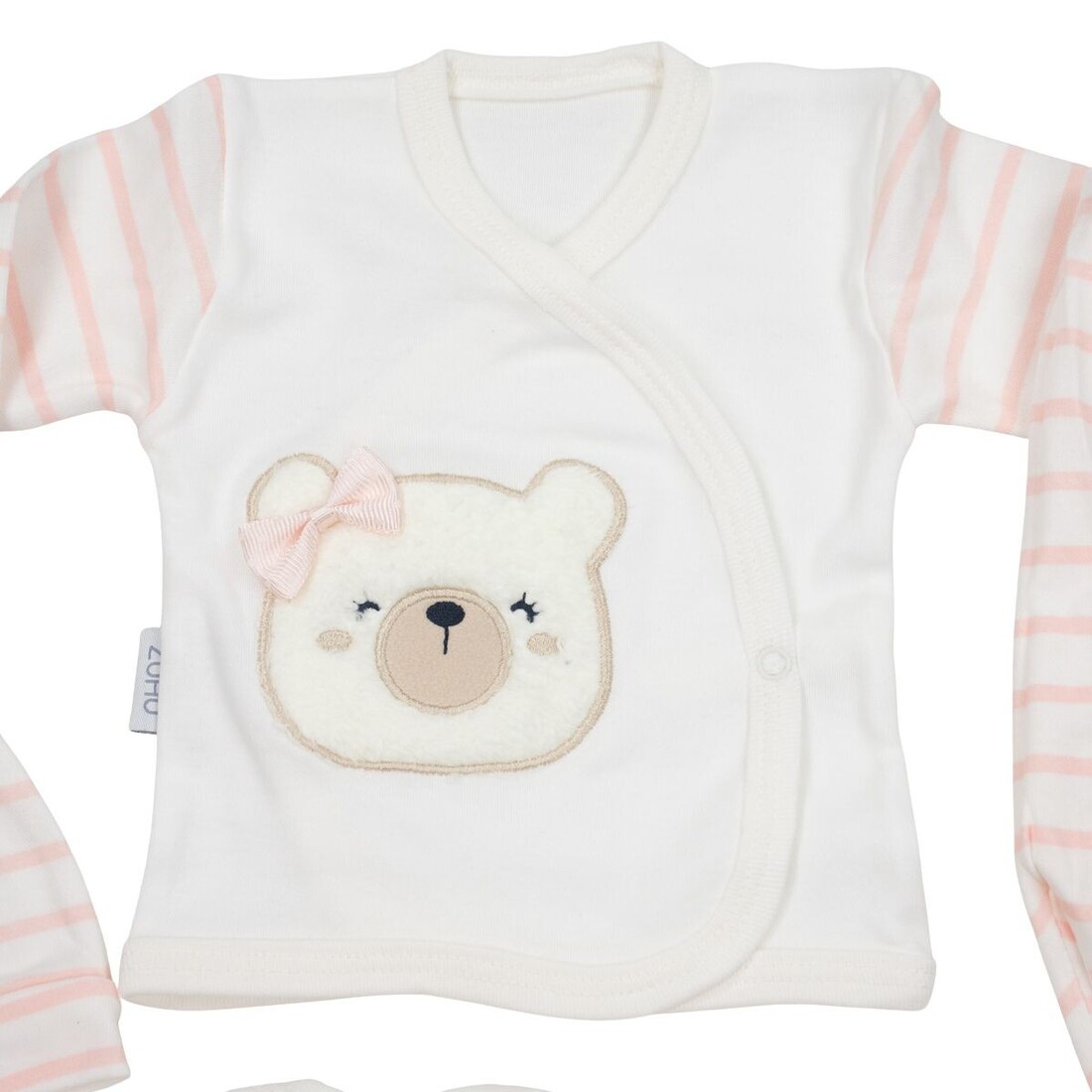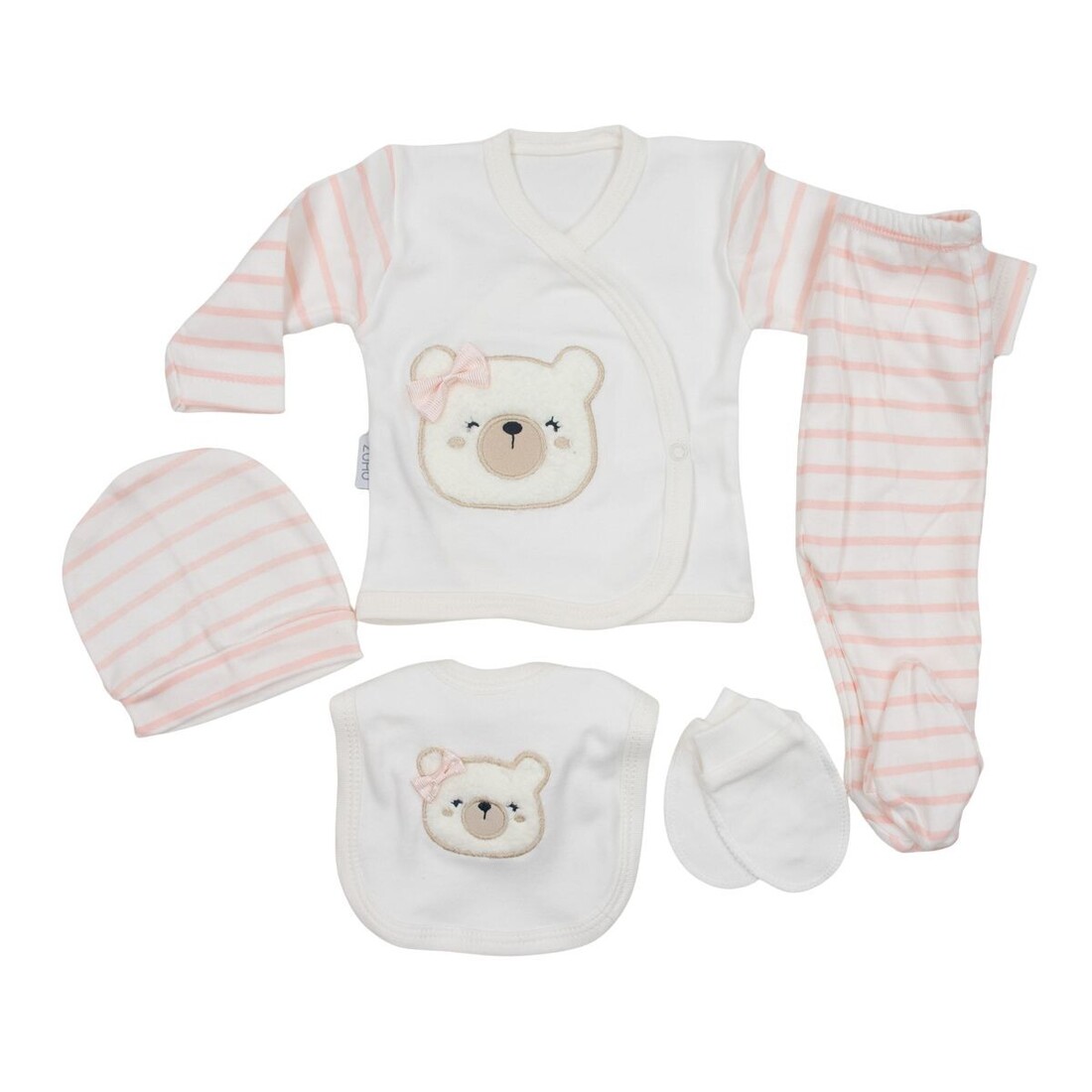 - Αποτελείται από μπλούζα με κουμπάκια, παντελόνι με ποδαράκια, σαλιάρα, σκουφάκι και γαντάκια,