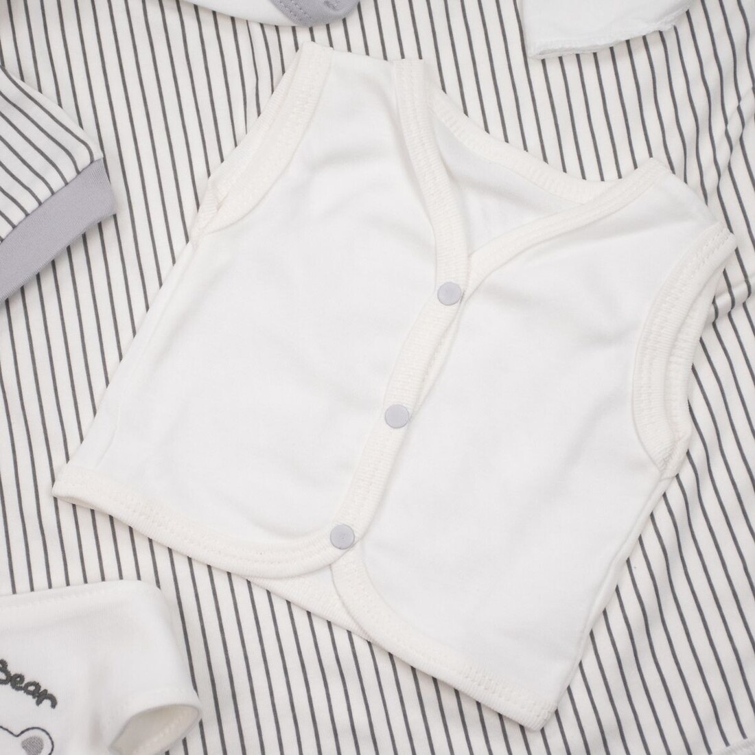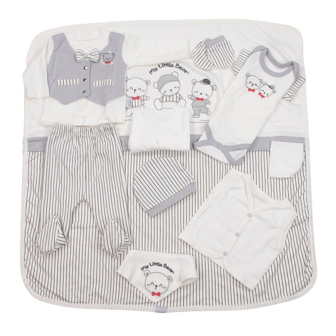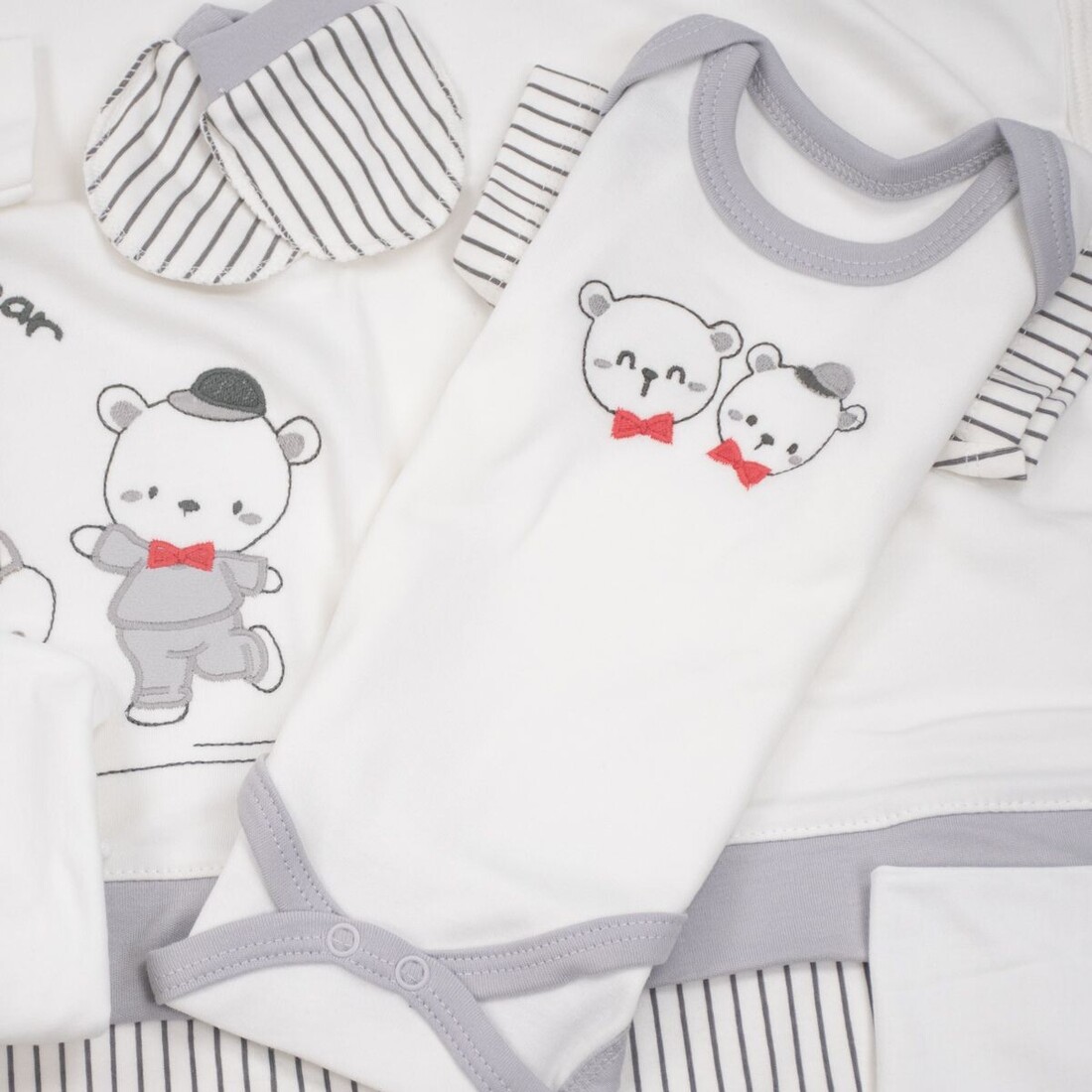 - Αποτελείται από : μπλουζάκι, παντελόνι, γαντάκια, σκουφάκι, σαλιάρα, βρεφικό κοντομάνικο και αμάνικο εσώρουχο, πανάκι ώμου, ζακέτα εσώρουχο και πάνα αγκαλιάς