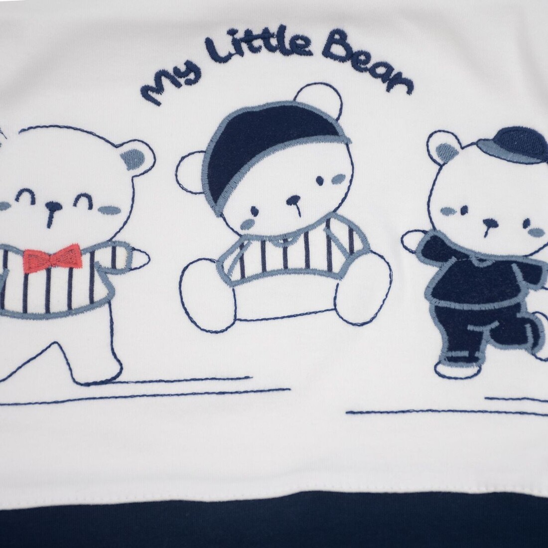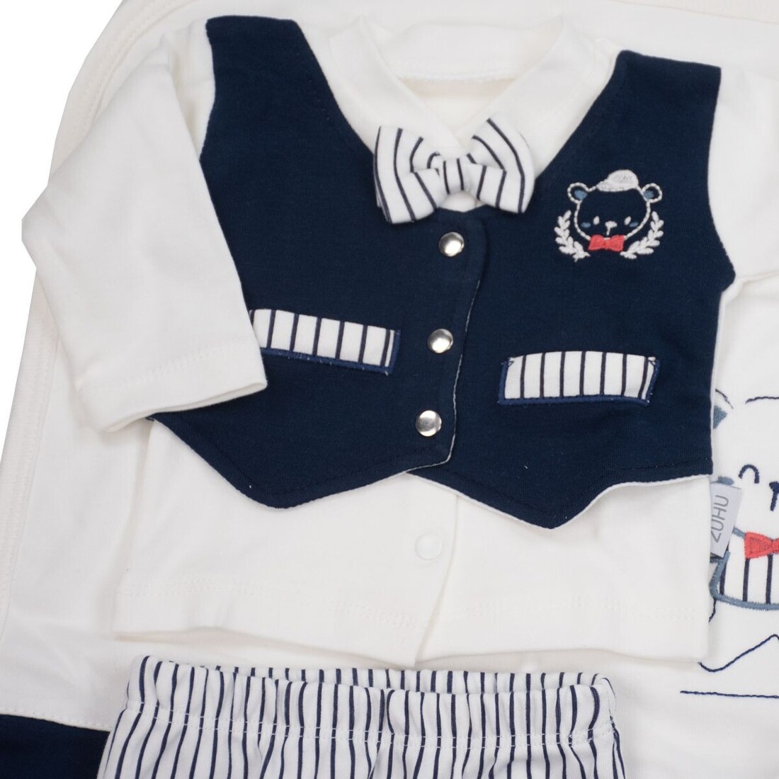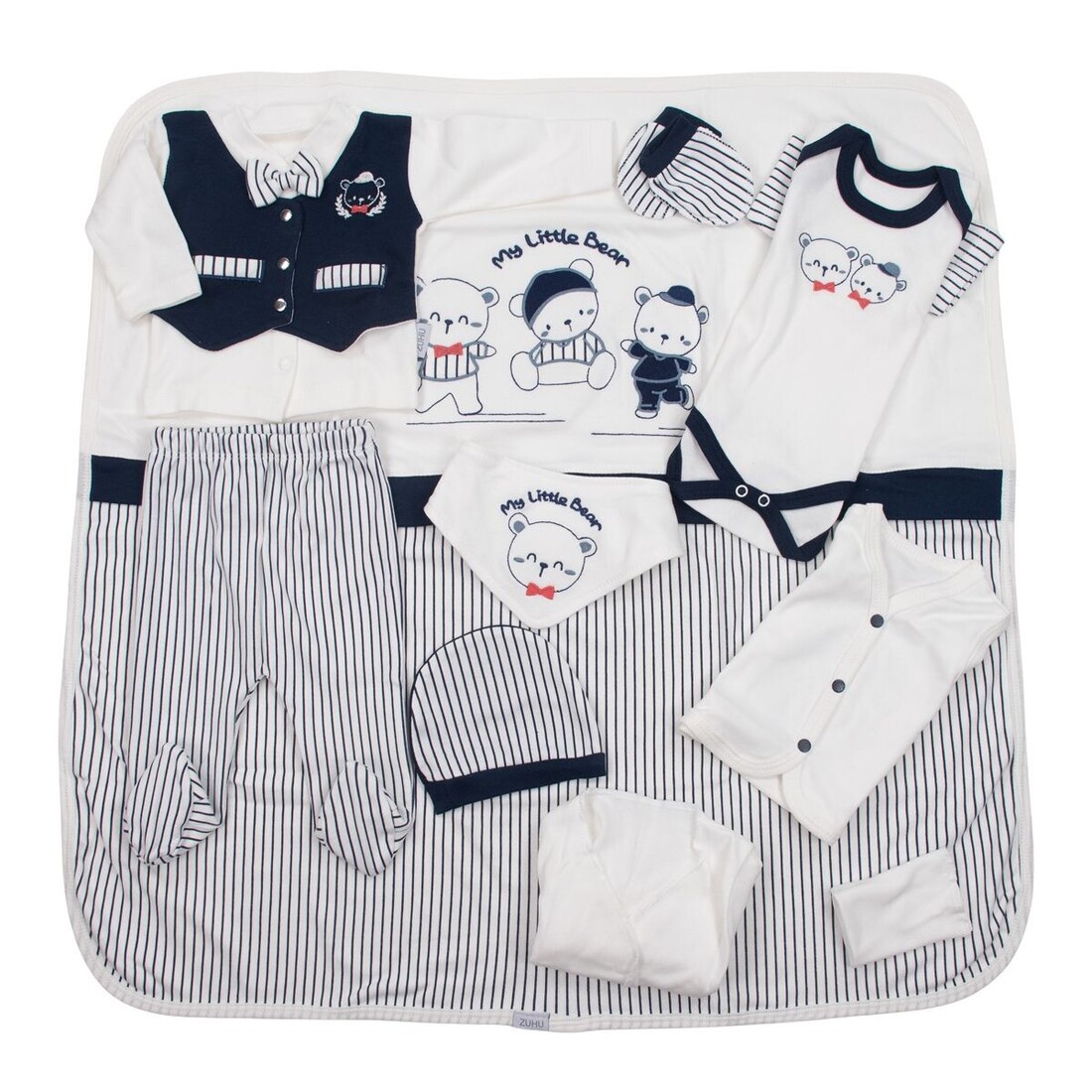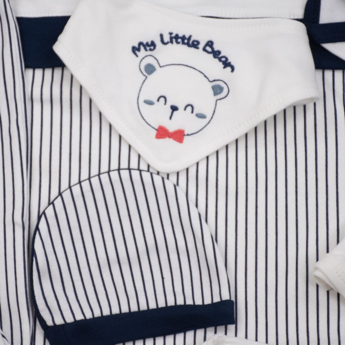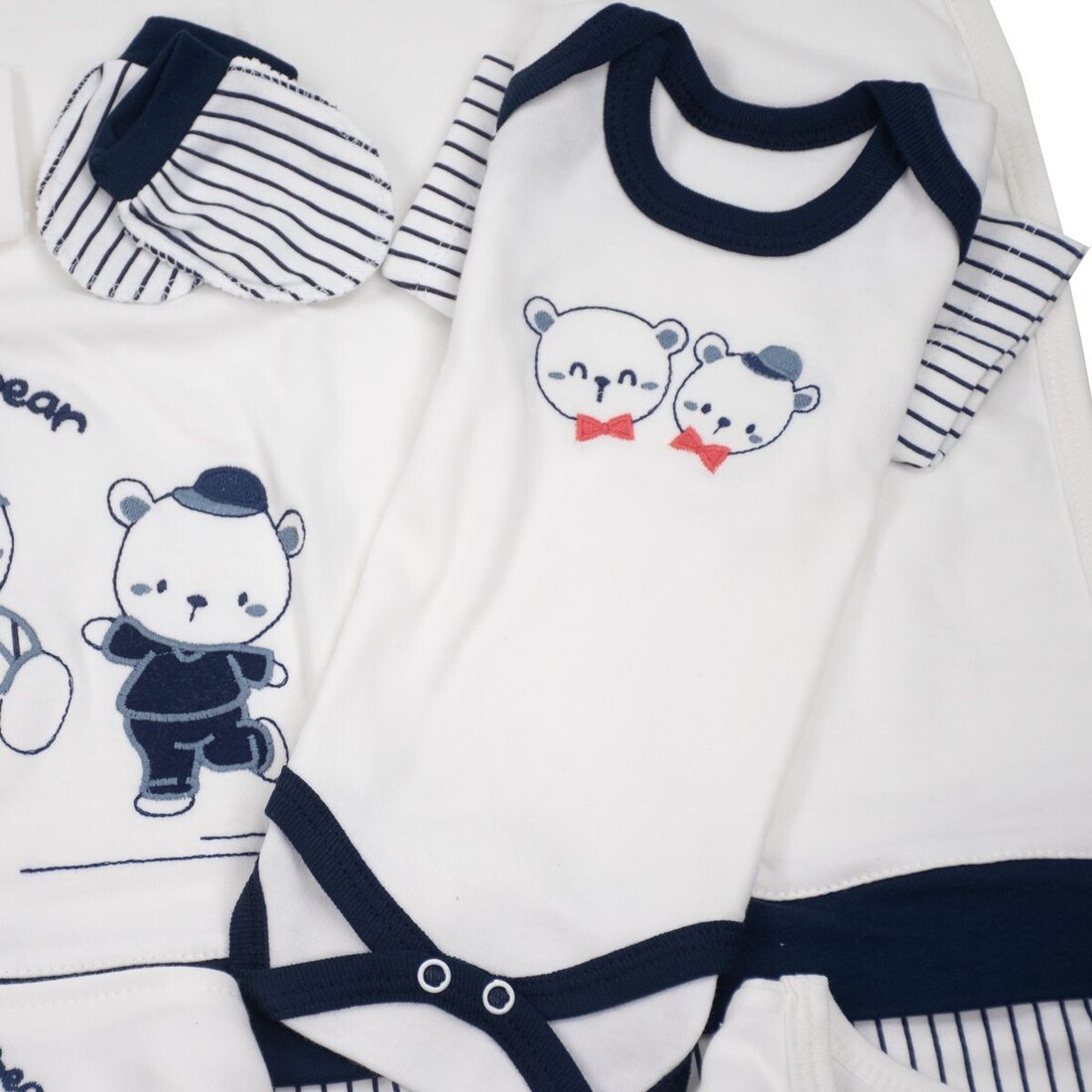 - Αποτελείται από : μπλουζάκι, παντελόνι, γαντάκια, σκουφάκι, σαλιάρα, βρεφικό κοντομάνικο και αμάνικο εσώρουχο, πανάκι ώμου, ζακέτα εσώρουχο και πάνα αγκαλιάς