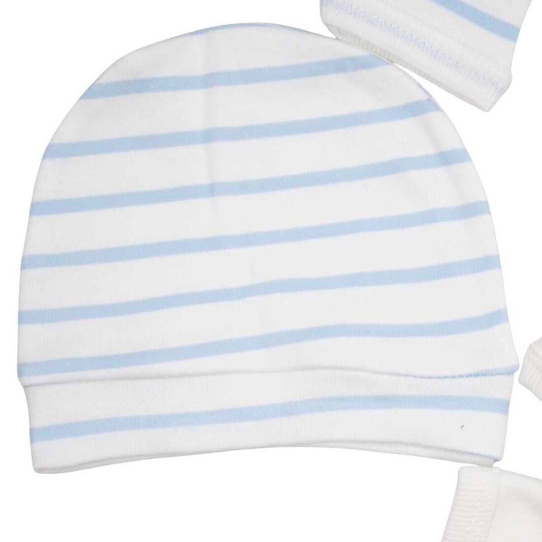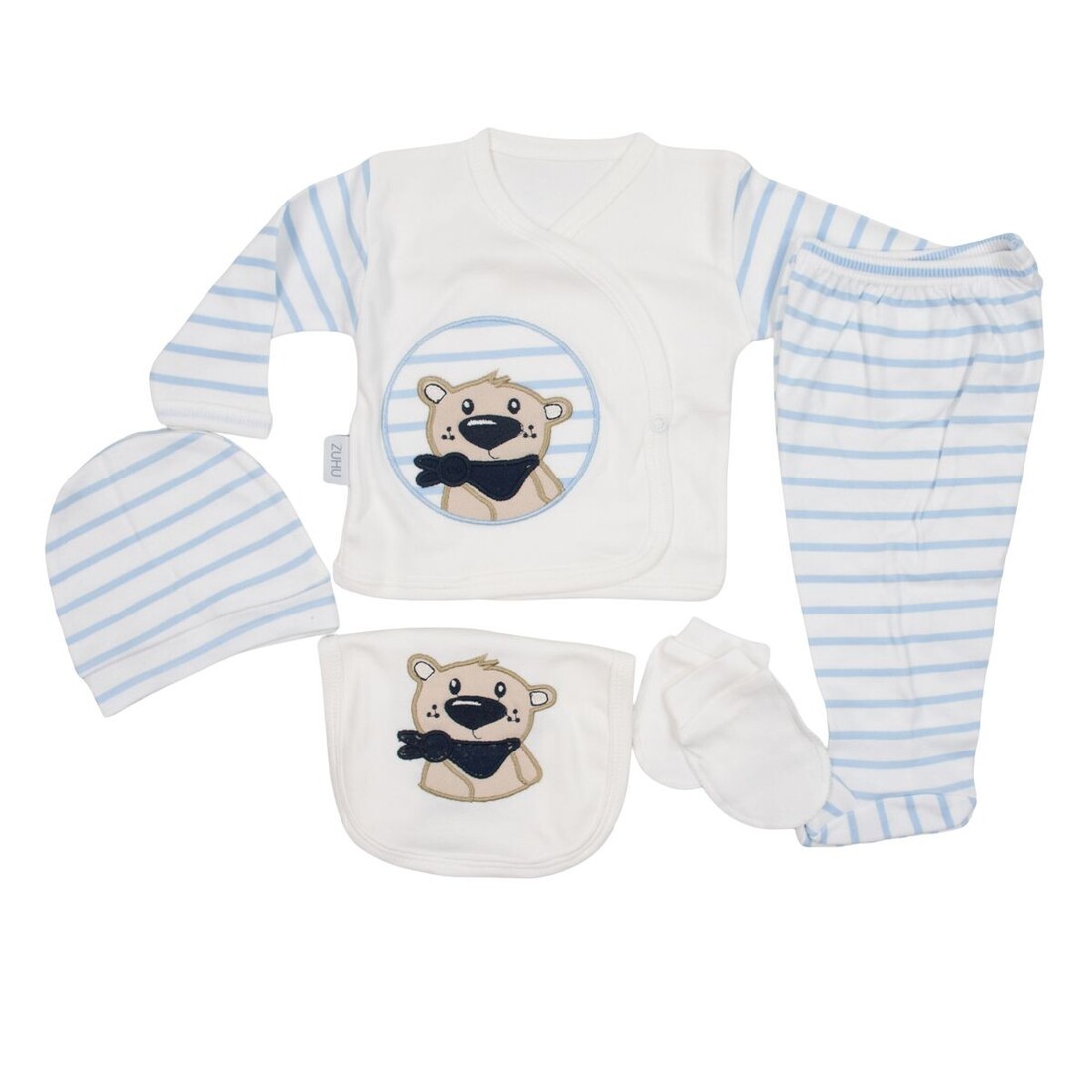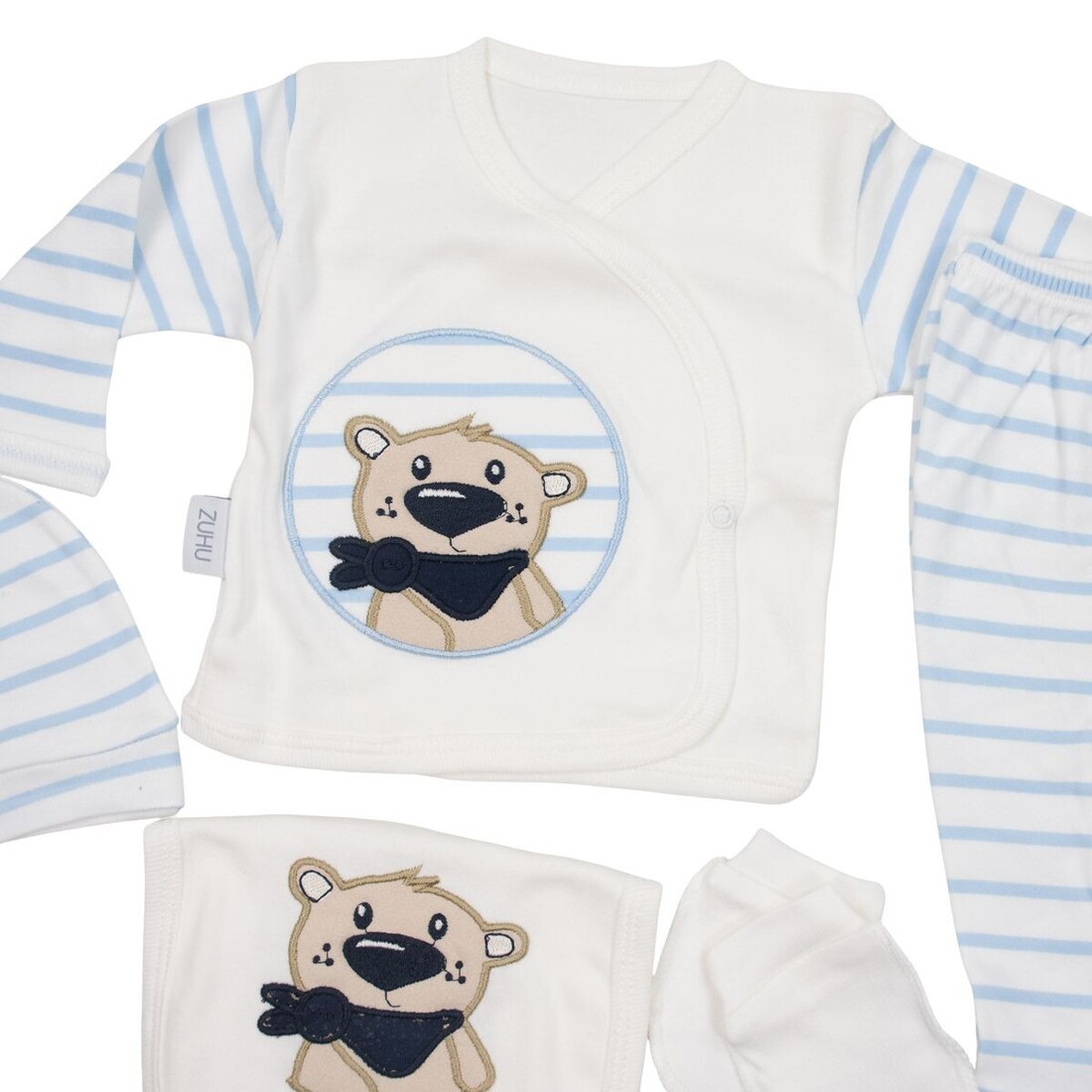 - Αποτελείται από μπλούζα με κουμπάκια, παντελόνι με ποδαράκια, σαλιάρα, σκουφάκι και γαντάκια,