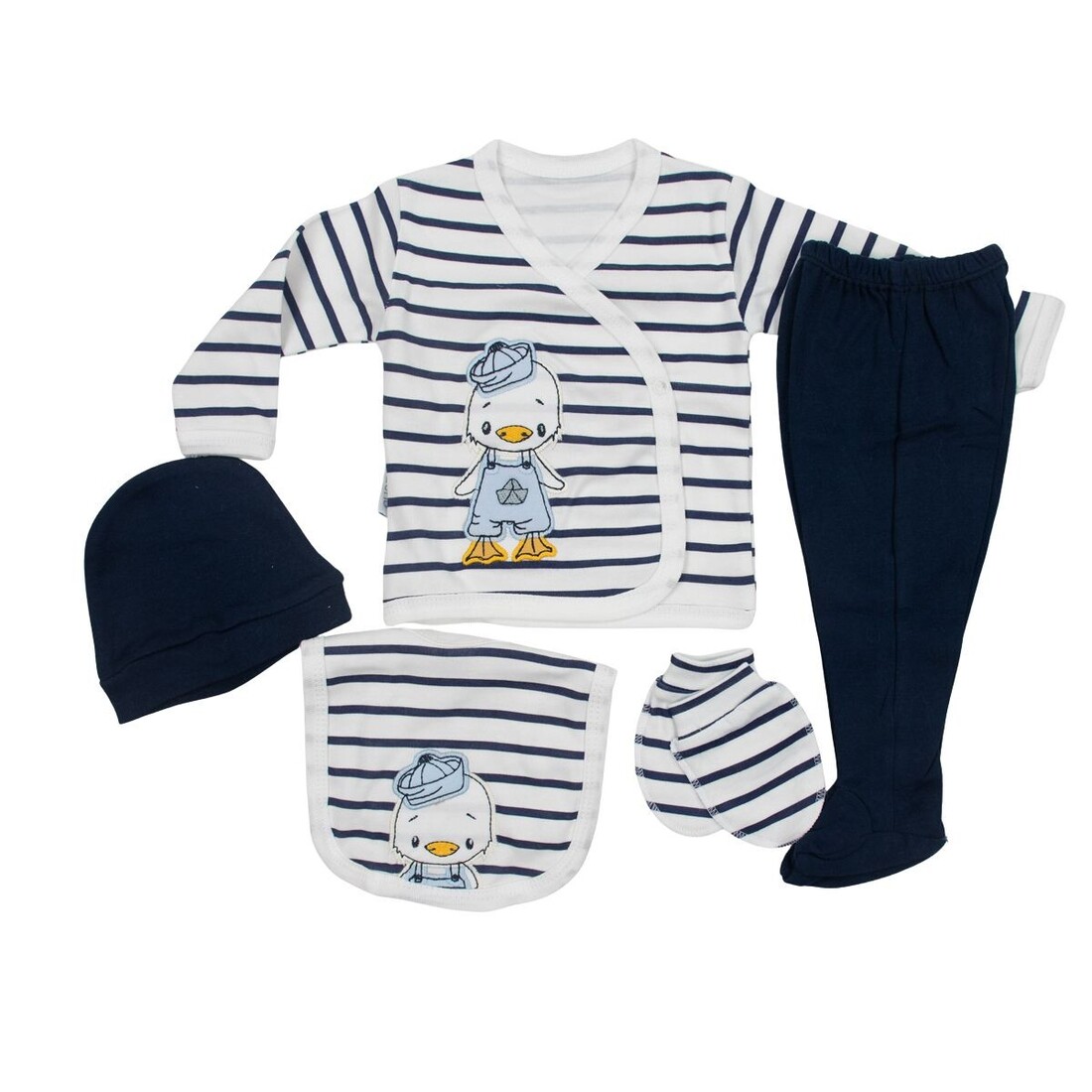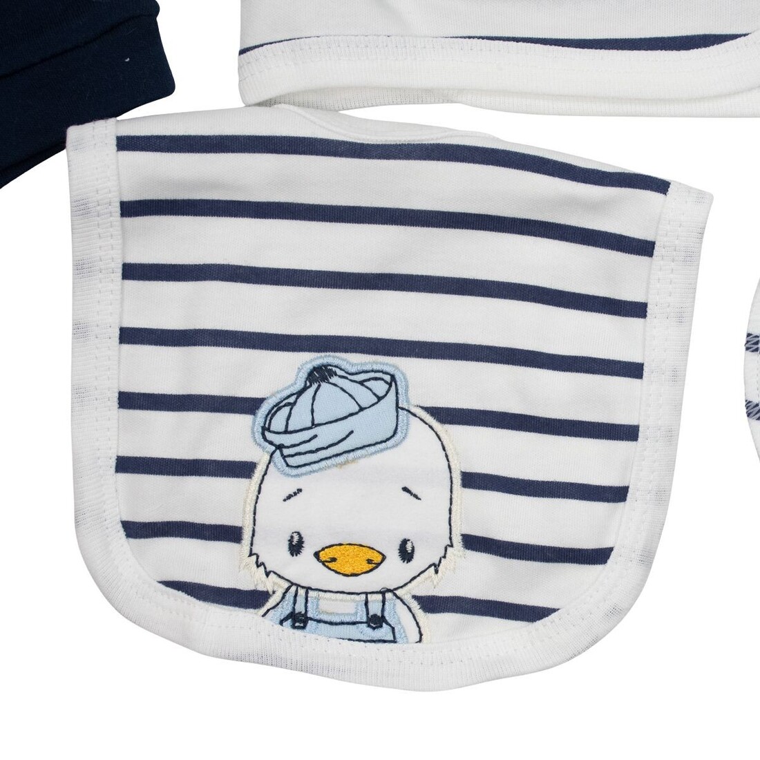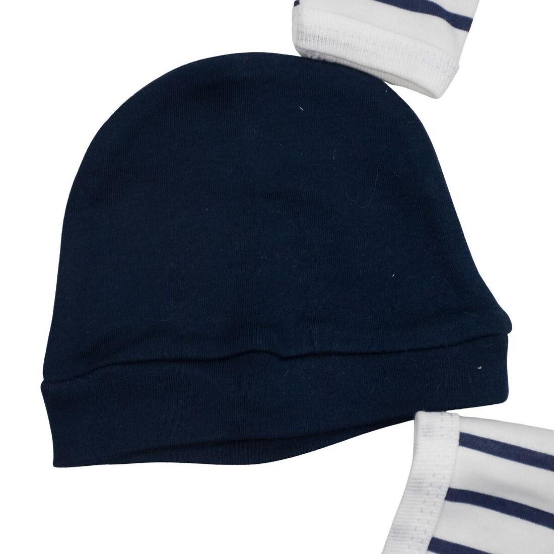 - Αποτελείται από μπλούζα με κουμπάκια, παντελόνι με ποδαράκια, σαλιάρα, σκουφάκι και γαντάκια,