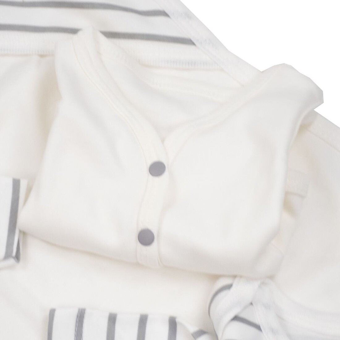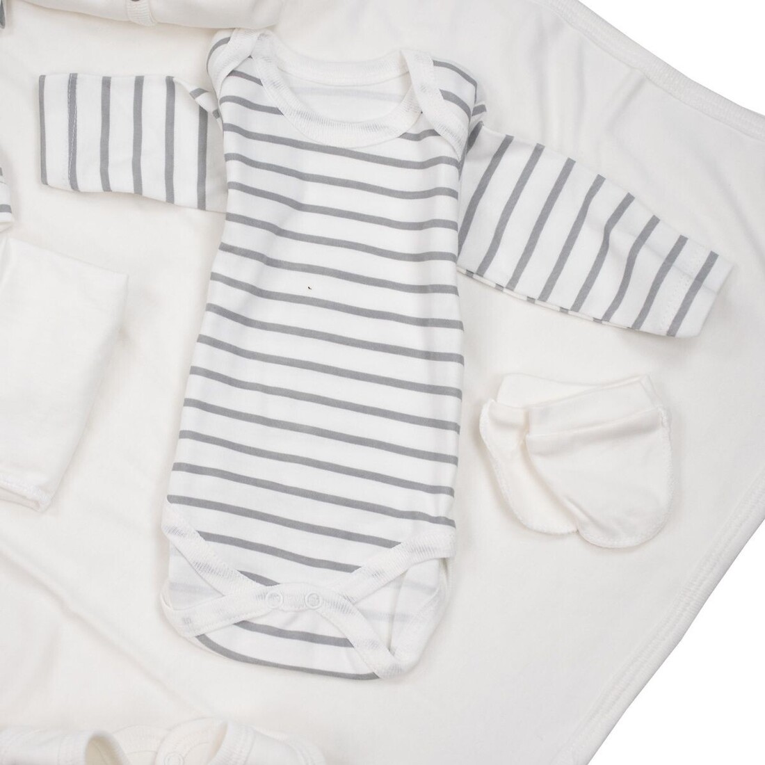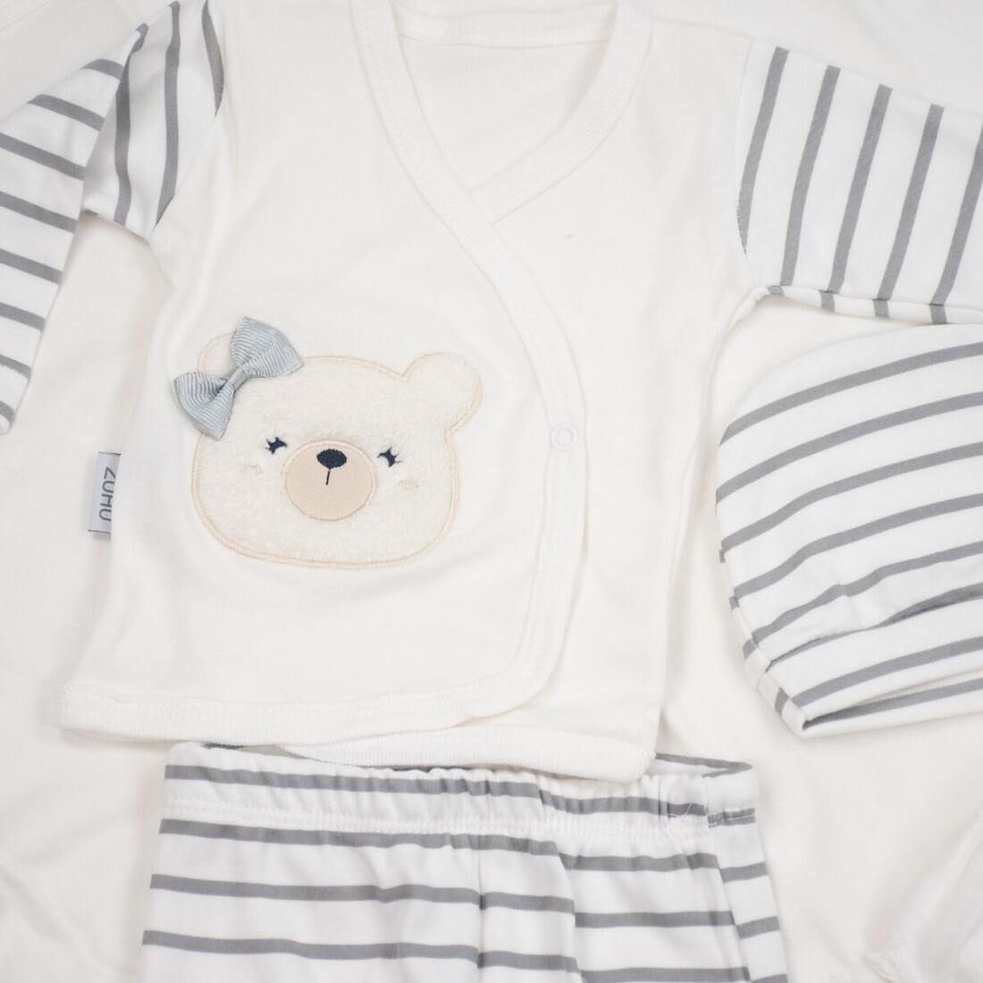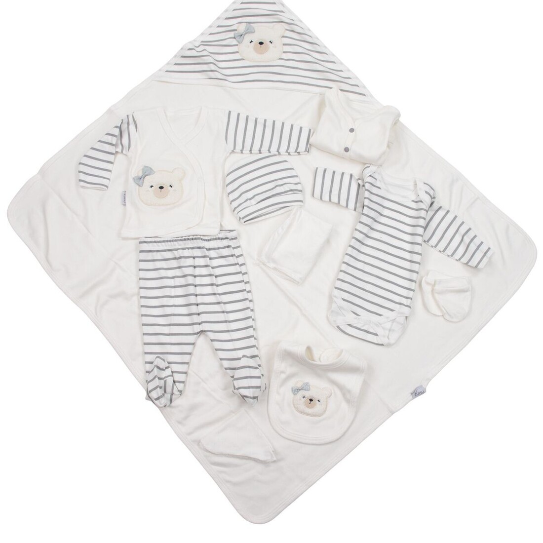 - Αποτελείται από : μπλουζάκι, παντελόνι, γαντάκια, σκουφάκι, σαλιάρα, βρεφικό κοντομάνικο και αμάνικο εσώρουχο, πανάκι ώμου, ζακέτα εσώρουχο και πάνα αγκαλιάς