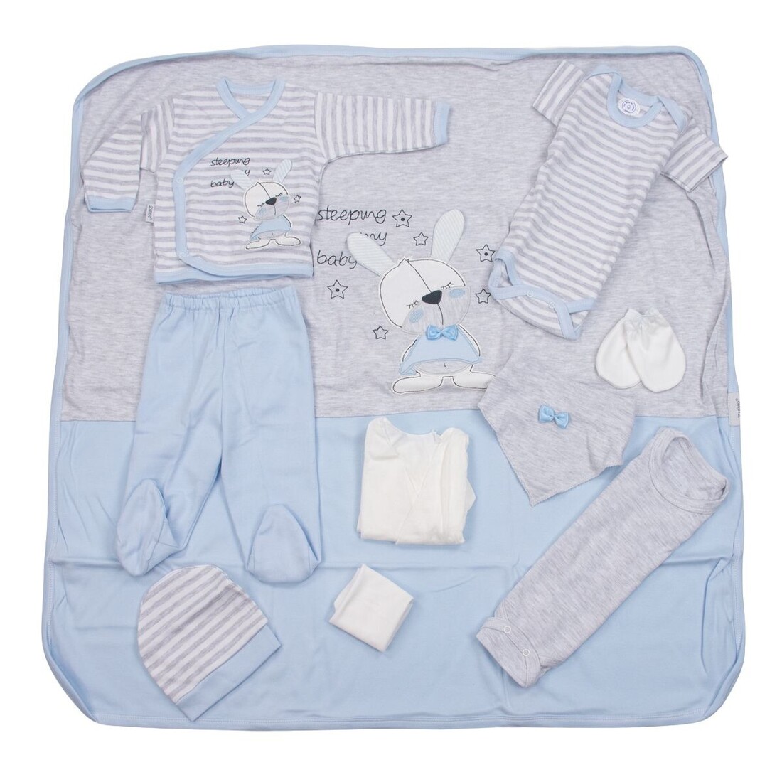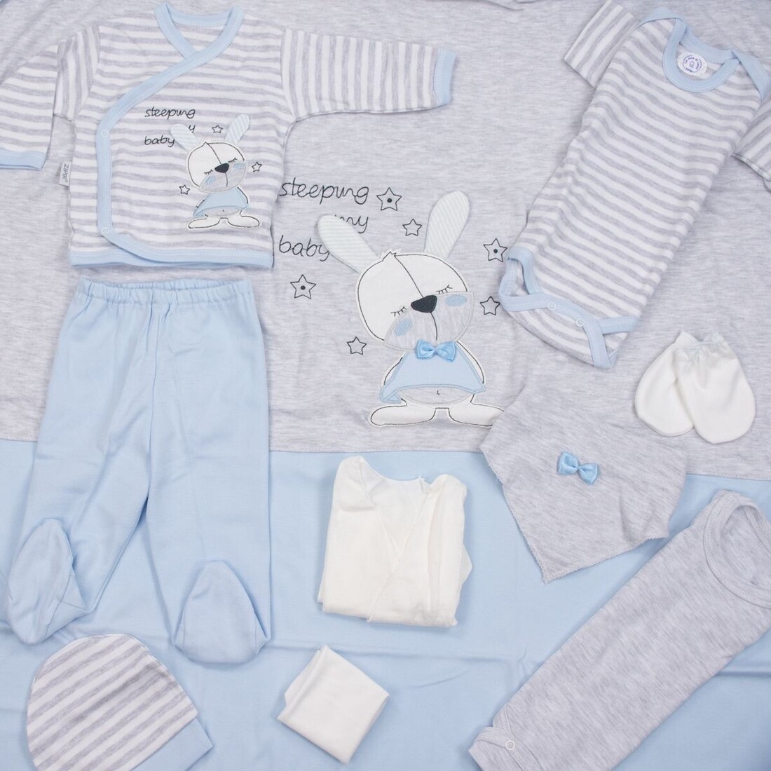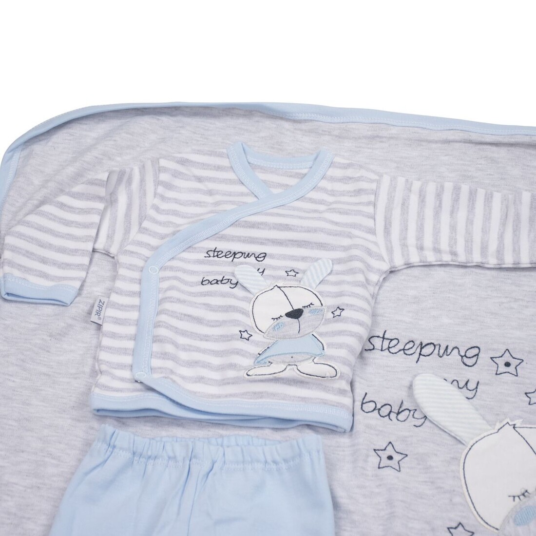 - Αποτελείται από : μπλουζάκι, παντελόνι, γαντάκια, καπέλο, σαλιάρα, βρεφικό κοντομάνικο εσώρουχο, πανάκι ώμου, ζακέτα εσώρουχο και πάνα αγκαλιάς