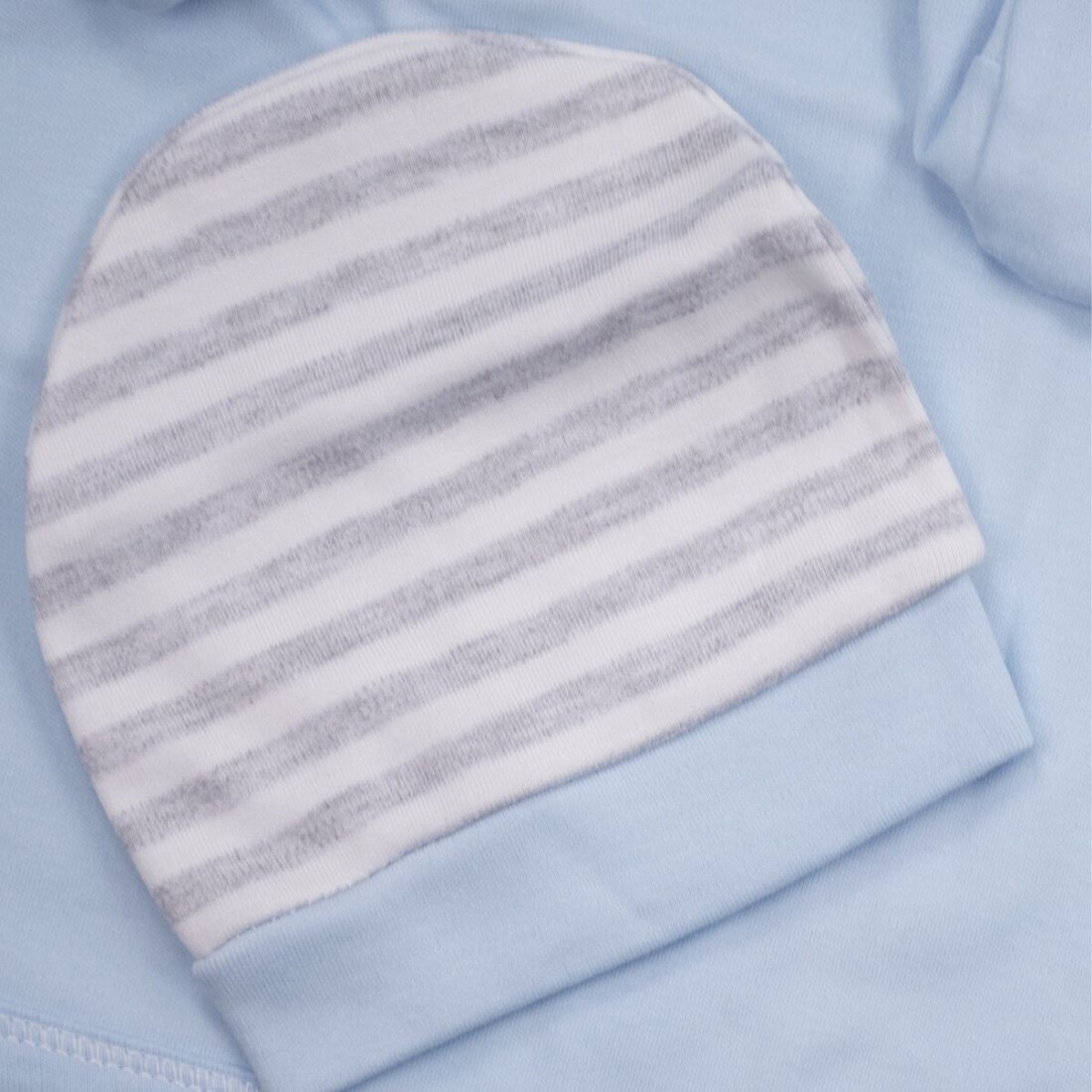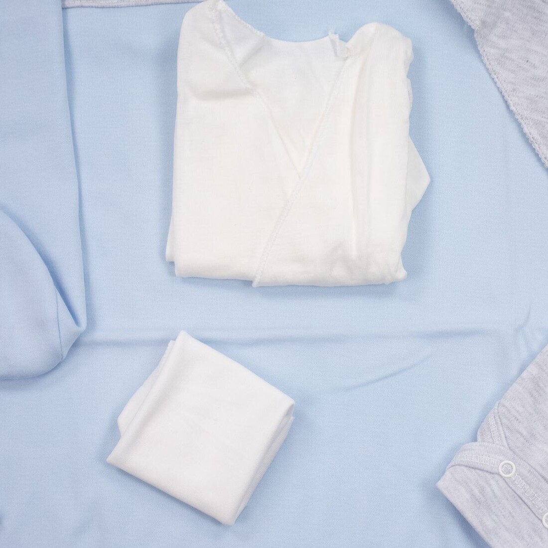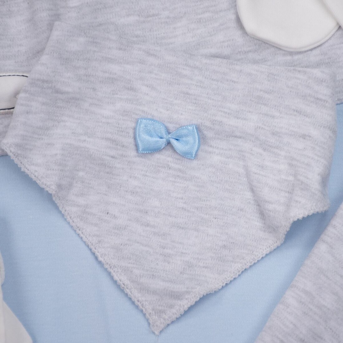 - Αποτελείται από : μπλουζάκι, παντελόνι, γαντάκια, καπέλο, σαλιάρα, βρεφικό κοντομάνικο εσώρουχο, πανάκι ώμου, ζακέτα εσώρουχο και πάνα αγκαλιάς